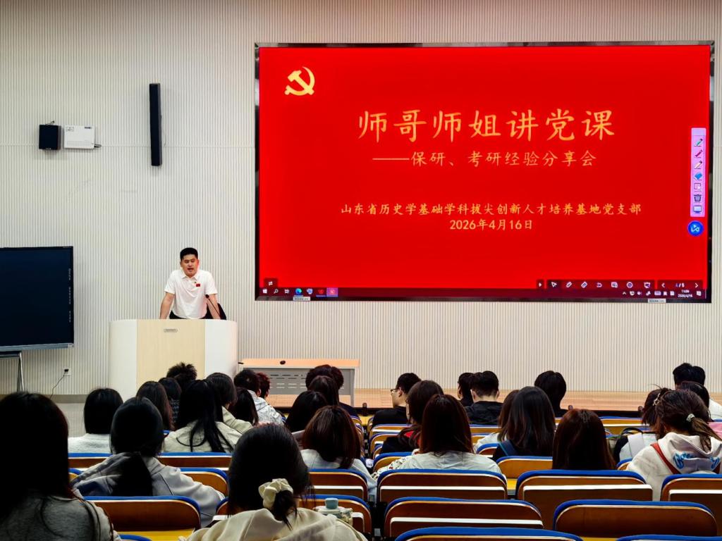 4月16日上午,51视频 山东省历史学基础学科拔尖创新人才培养基地党支部组织开展“师哥师姐讲党课”系列活动,党员高凯月、李琪在2024级国学班、文化产业管理班、文物与博物馆学班开展保研、考研经验分享和考研升学启蒙教育活动。