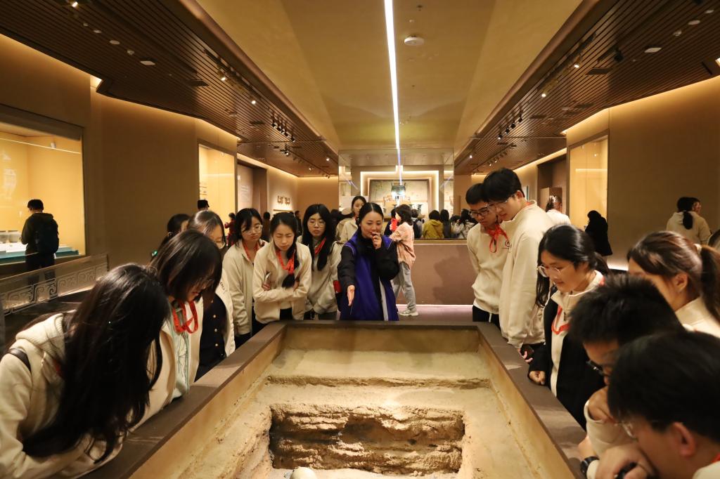 在遗址现场,师生们依次参观了宫殿基址、甲骨窖穴、车马坑等重要遗迹。通过指导老师的细致讲解,同学们对商代的宫殿布局、祭祀礼仪、文字体系与社会结构有了更为立体和深刻地理解。大家驻足于出土文物前,就甲骨文的释读、青铜器的铸造工艺等问题展开了热烈讨论,现场学术氛围浓厚。