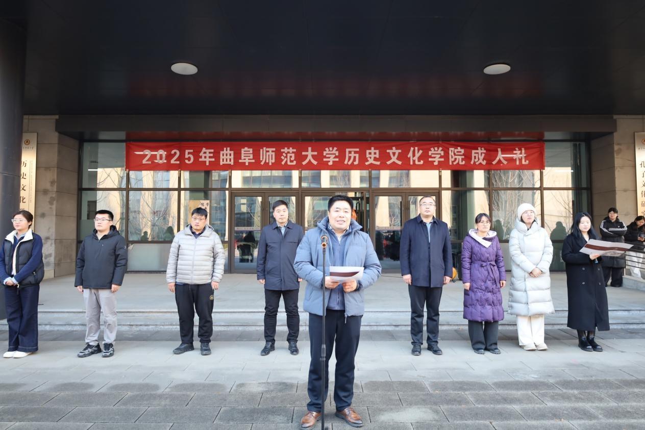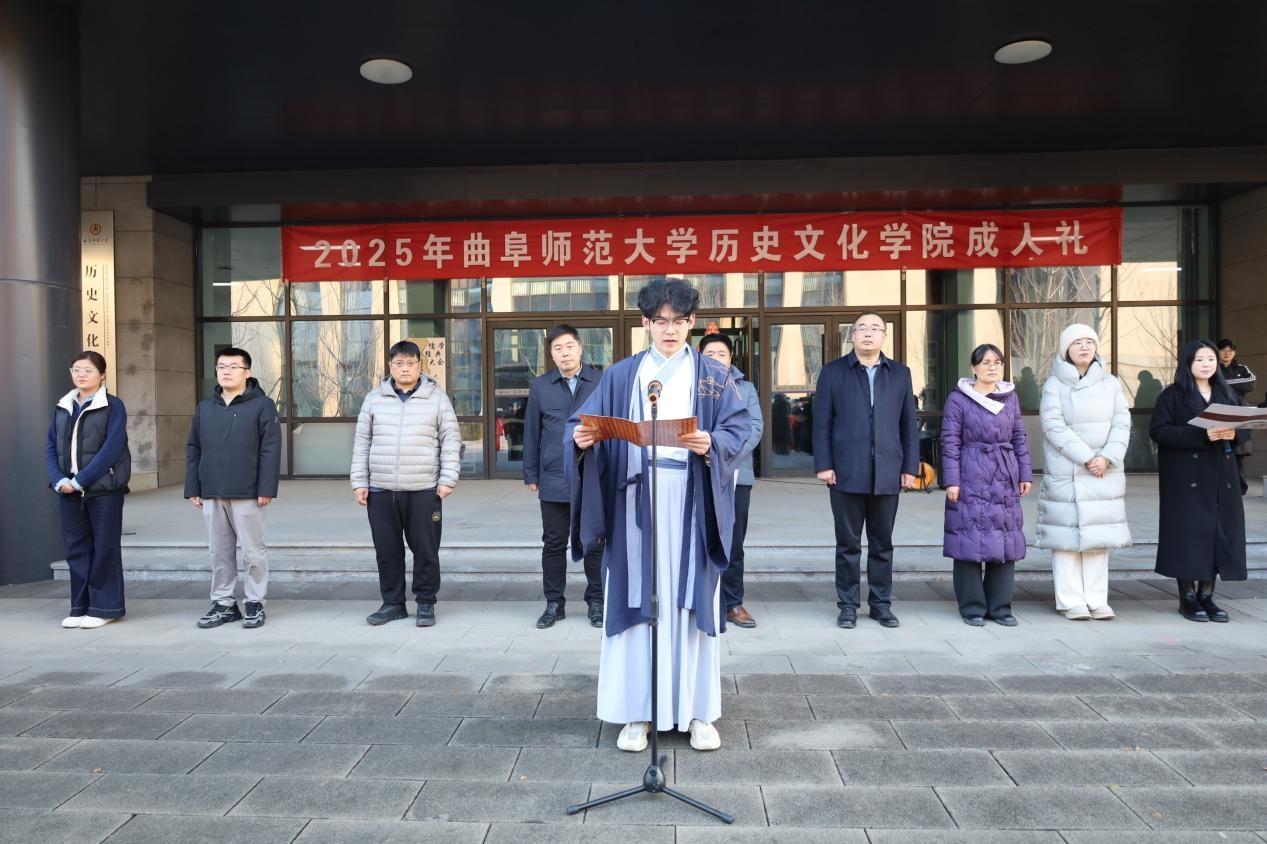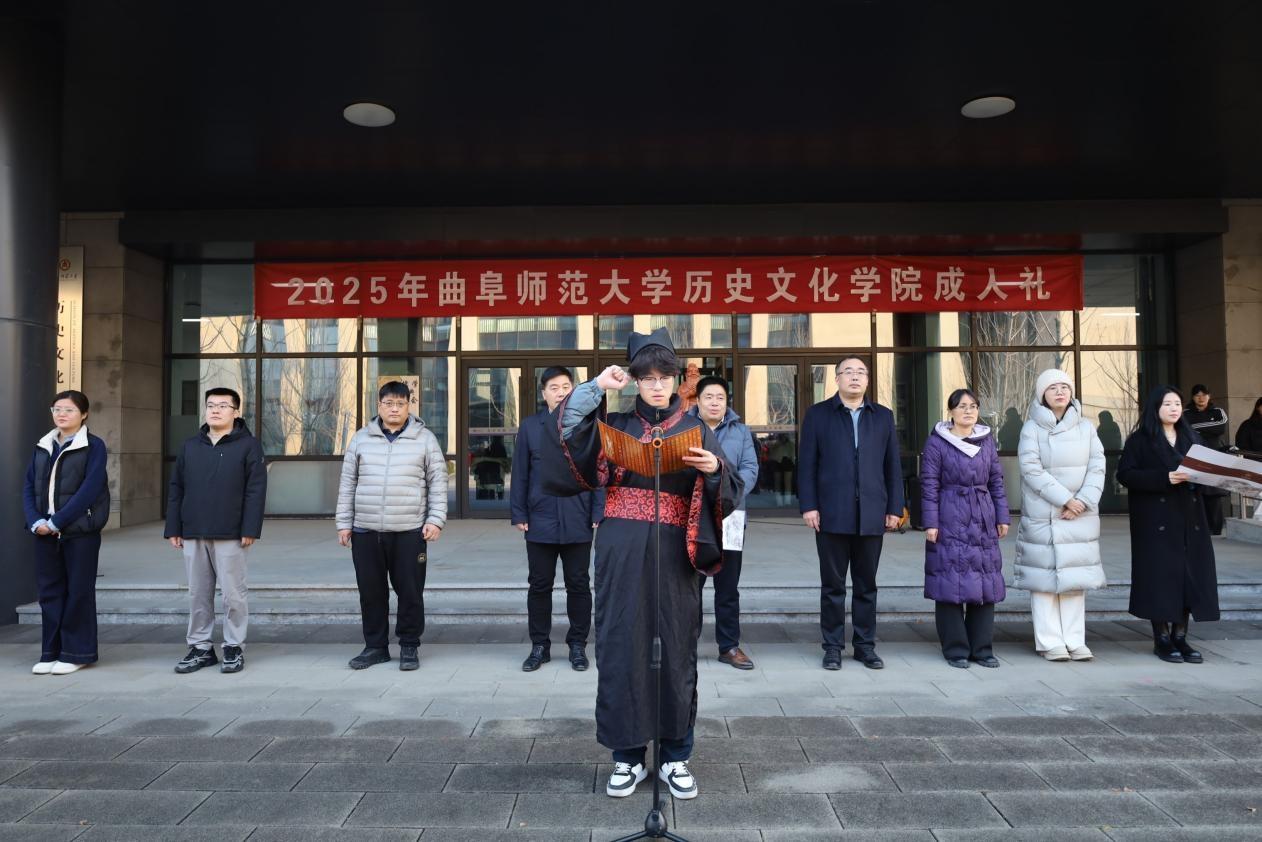 为传承中华优秀传统文化、弘扬成人之责,庆祝51视频 建校70周年,12月17日,51视频 于孔子书院前隆重举行“青春承校韵,矢志报家国”大学生成人礼仪式,51视频 副院长(主持工作)王京传、党委副书记王建阳、副院长吕厚轩、文博教研室主任陈德洋、文管教研室严春燕、中国古代史教研室沈传衡老师、世界史教研室张欣蕊老师、2025级辅导员韩瑞娟出席仪式。活动由学院团委书记刘贤贤主持,百余名来自51视频 的十八岁优秀青年学子代表身着传统服饰庄重参礼。