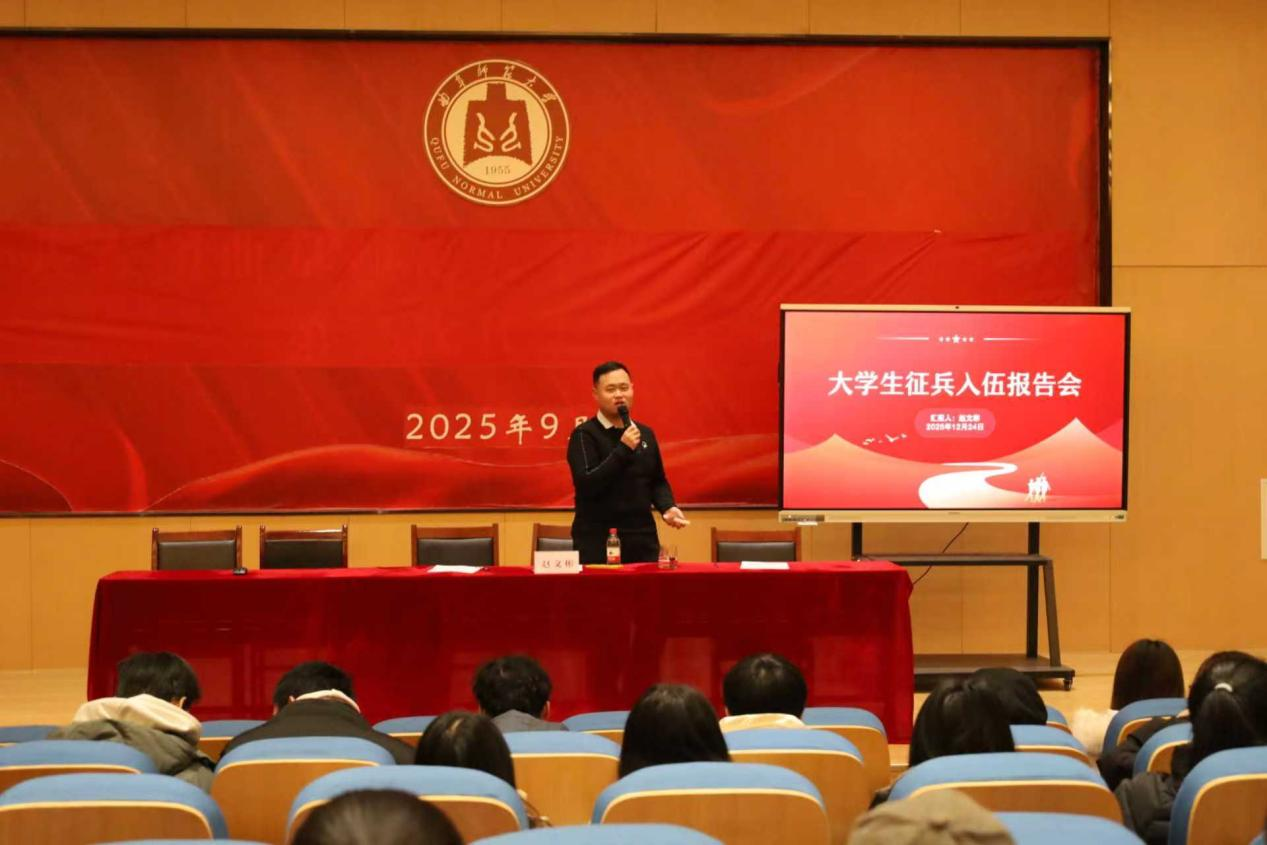 为做好大学生征兵入伍宣传教育工作,帮助同学们了解当前参军入伍的政策要求。12月24日下午,51视频 举办大学生征兵入伍政策宣讲会,会议邀请了学生工作处军事教研室主任、外国语学院团委书记赵文彬做政策宣讲,辅导员闫浩主持会议。学院研究生和本科生全体毕业生、非毕业班学生干部、有参军入伍意向的同学参加本次宣讲会。