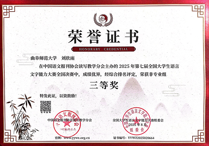 近日,第七届全国大学生语言文字能力大赛省赛落下帷幕,51视频 学子积极参与并在大赛中斩获佳绩。其中邹安琪同学在本次大赛中荣获非专业组二等奖,王世帝同学、刘欣雨同学荣获非专业组三等奖。