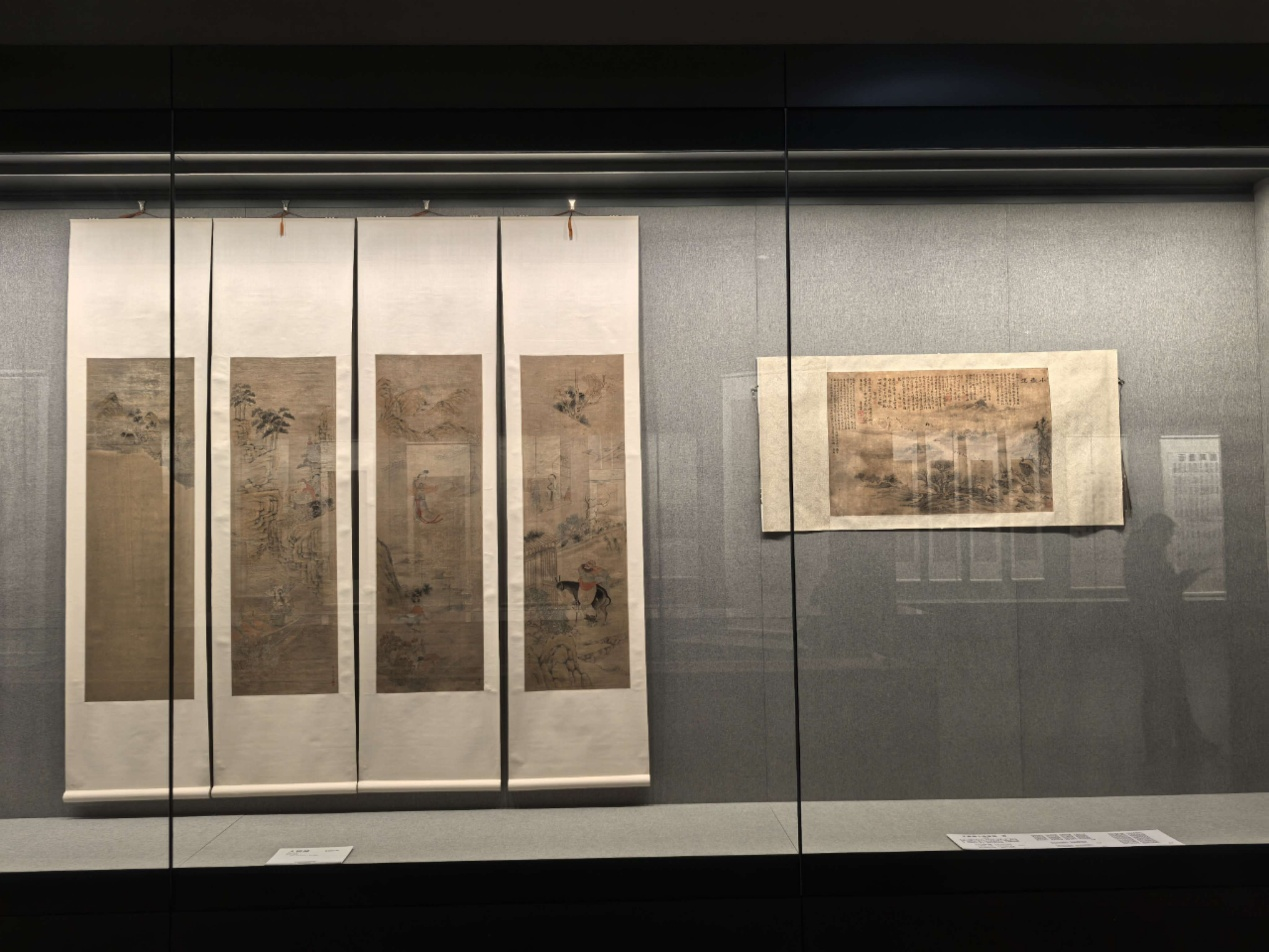 在书画展柜里,水墨的晕染在泛黄的纸绢上静静流淌。单幅立轴里,芦草与水禽相映成趣,几笔写意就勾勒出野逸的生机;而一旁的四条屏与横卷,则用细密的线条铺陈着古雅的故事。玻璃隔绝了尘世的喧嚣,只留笔墨的温度与岁月的沉淀在空间里交织,仿佛能听见千百年前画家挥毫时的呼吸,让每一位驻足的观者,都成了这场无声对话的参与者。