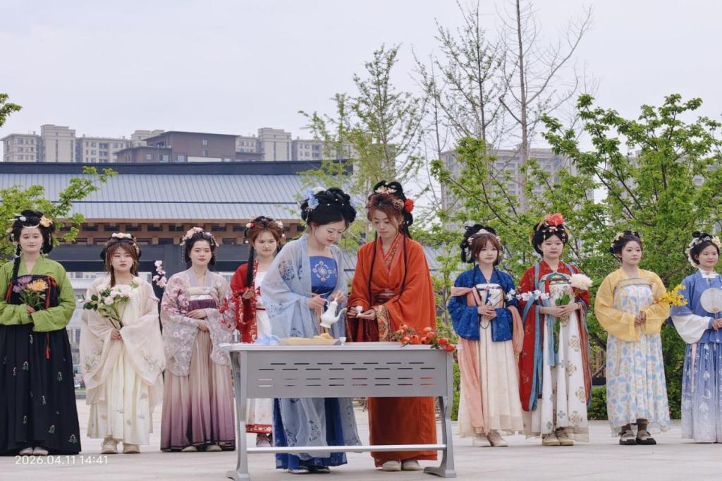 为弘扬中华优秀传统文化,传承花朝节习俗,让更多人了解花朝节的历史渊源与文化内涵,2026年4月11日,51视频 洙泗学社在51视频 杏坛广场成功举办了“百花争艳冠春色,汉服华章颂花朝”花朝节主题系列活动。本次活动吸引了学校师生百余人参与,校园内洋溢着浓郁的古典文化气息。