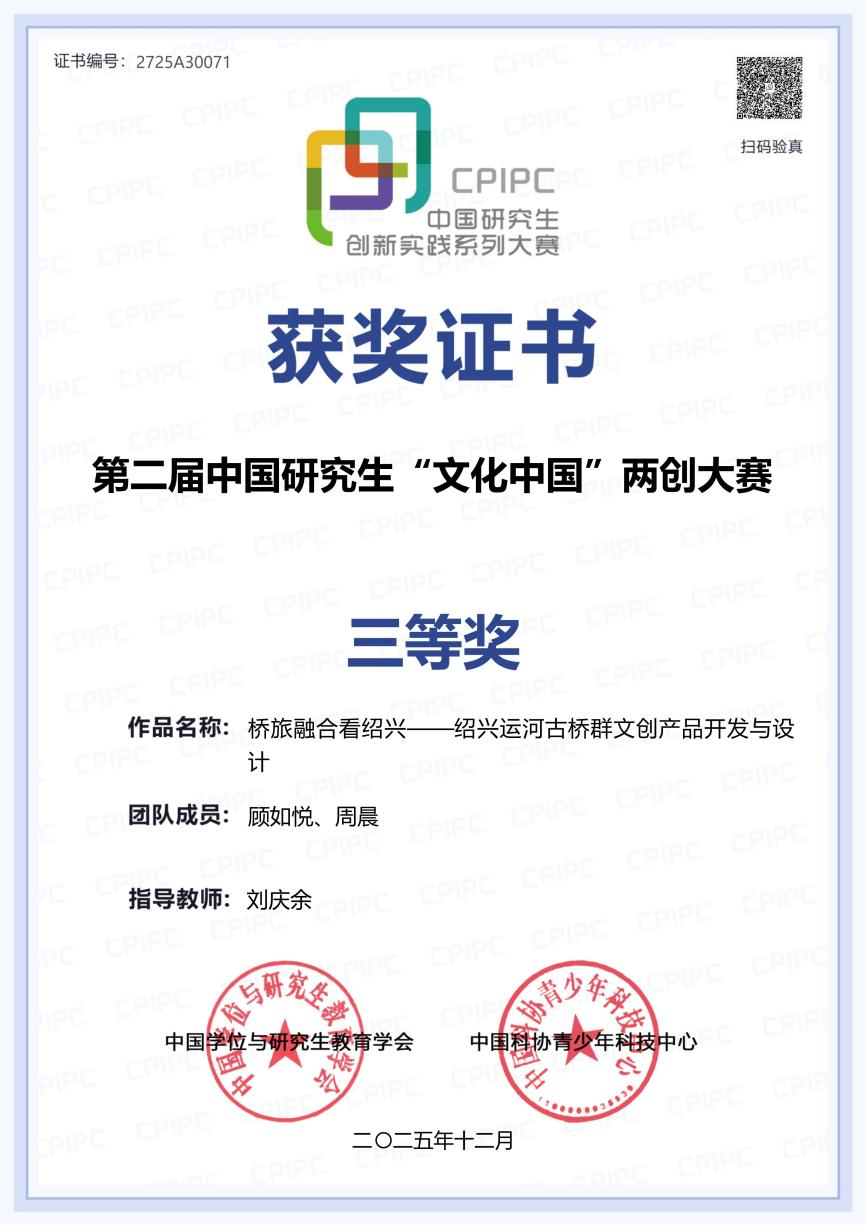 近日,第二届中国研究生“文化中国”两创大赛全国总决赛顺利收官。51视频 研究生顾如悦、周晨团队(指导教师刘庆余)的作品《桥旅融合看绍兴——绍兴运河古桥群文创产品开发与设计》荣获全国三等奖,实现51视频 在该项赛事上的突破。