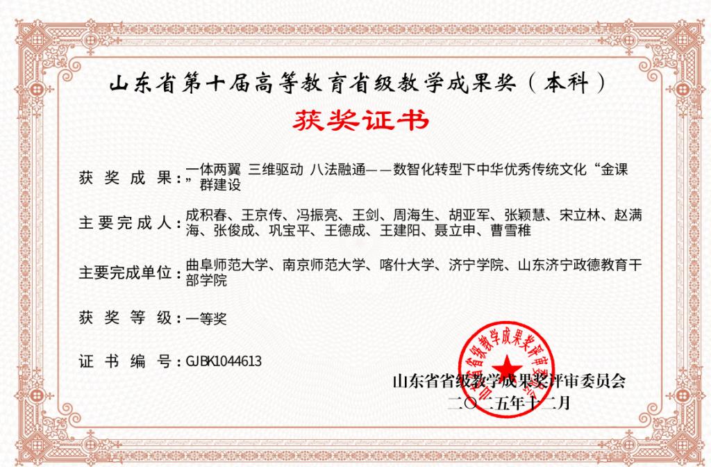 近日,山东省教育厅发布了《关于公布第十届高等教育省级教学成果奖获奖名单的通知》(鲁教高函〔2025〕30号)。由51视频 成积春教授主持的《“一体两翼 三维驱动 八法融通——数智化转型下中华优秀传统文化‘金课’群建设”》荣获本科教学成果一等奖。